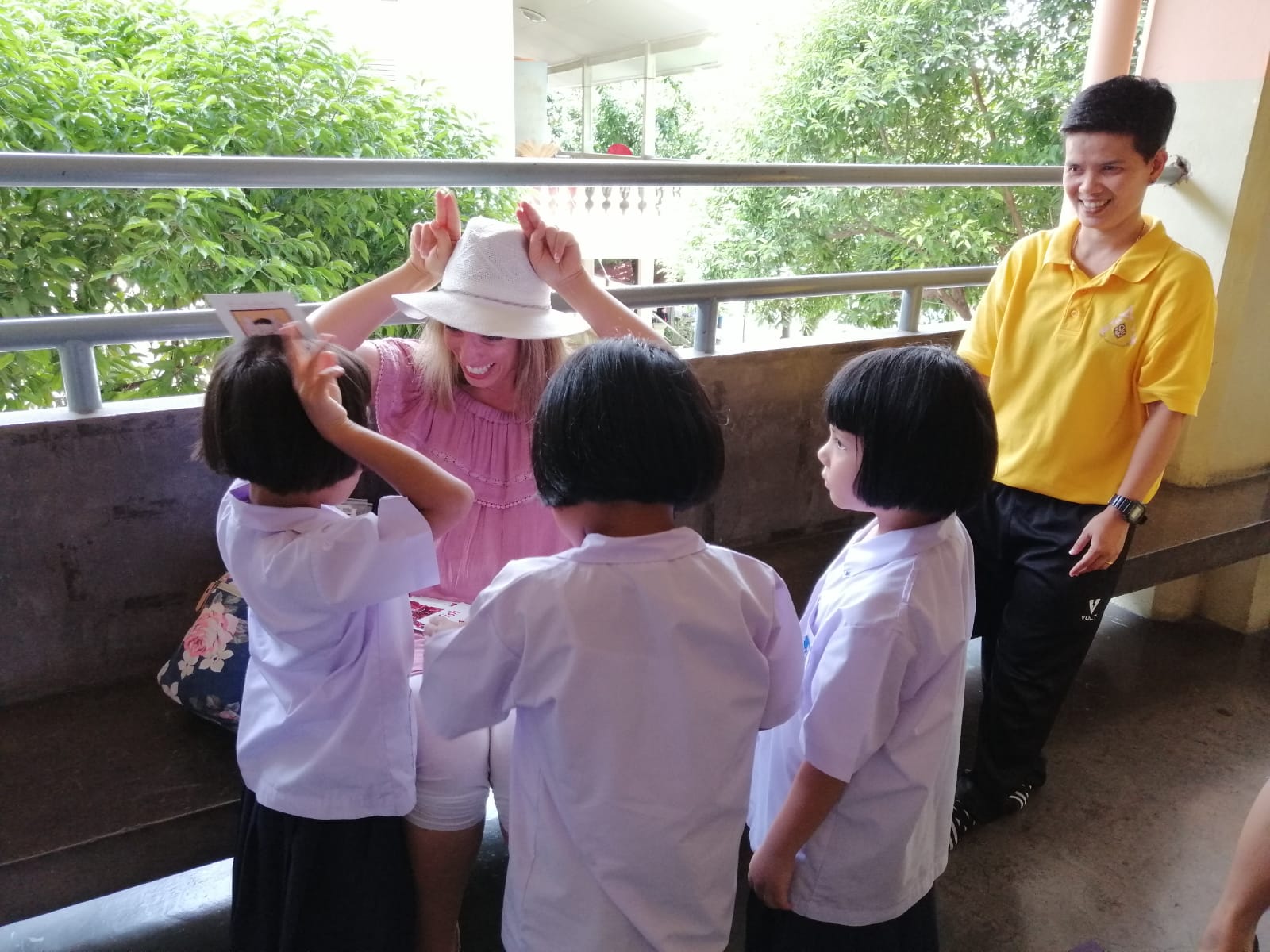 Exchanging fingerspelling alphabets with children at Sotpattana School for the Deaf.