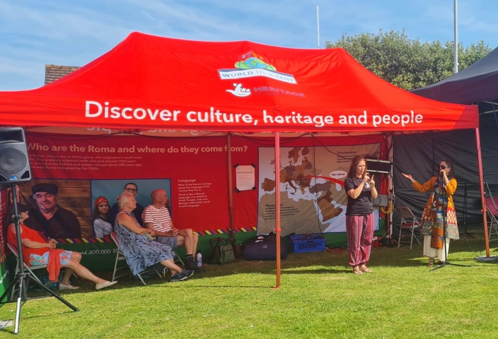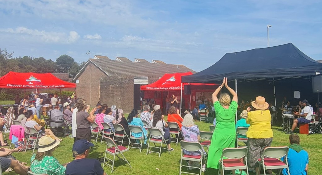 Interpreting for an outdoor art exhibition tour during the Folkestone Triennial arts festival.